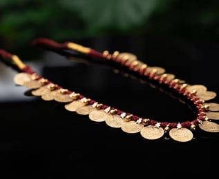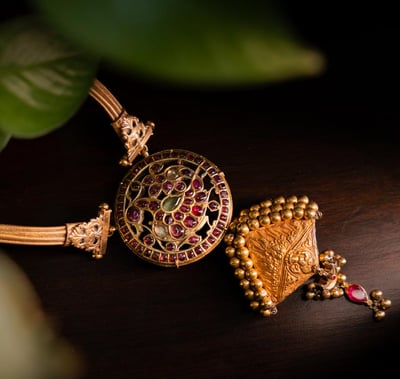 Embodying the essence of tradition and luxury, this Divine Elegance Temple Jewellery Set features a regal necklace and matching earring adorned with intricate Goddess Lakshmi motifs. The rich gold detailing, surrounded by cluster of delicate green beads, creates a mesmerising contrast, making it a perfect choice for brides and festive occasions.